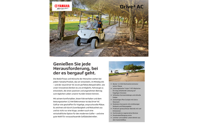 Die Bedürfnisse und Wünsche der Menschen stehen bei jedem Yamaha-Produkt, das wir entwickeln, im Mittelpunkt – und der neue Drive² AC ist ein perfektes Beispiel dafür, wie unser innovatives Denken es uns ermöglicht, Fahrzeuge zu entwickeln, die einen positiven und angenehmen Beitrag zum täglichen Leben unserer Kunden leisten können.